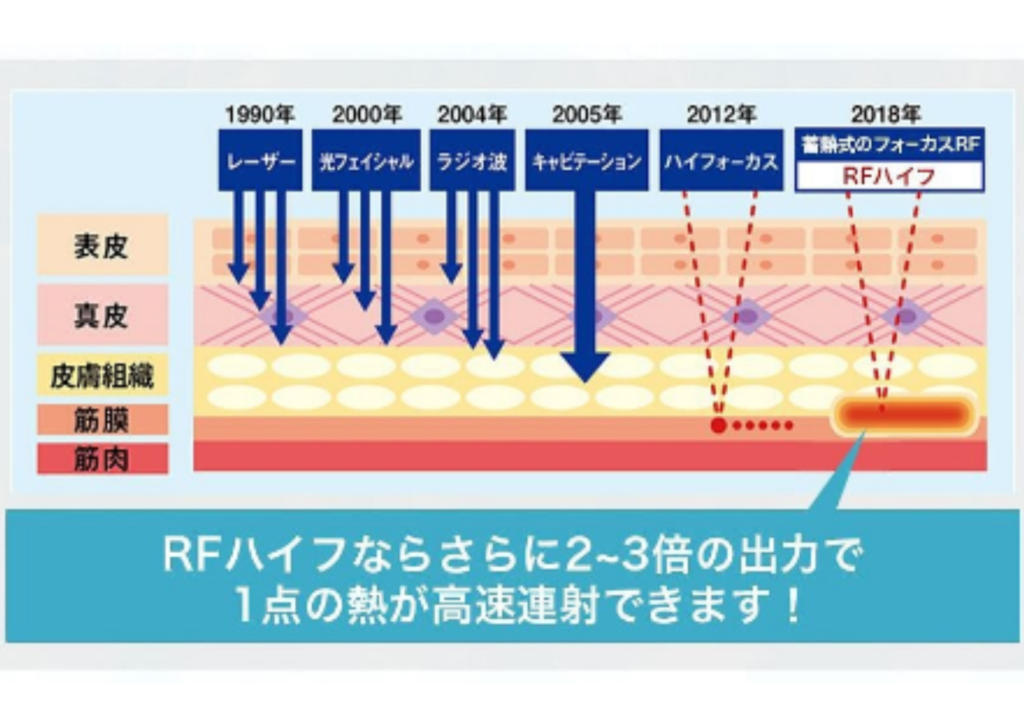この技術は、真皮層から脂肪層、さらに筋膜層(SMAS層)までにエネルギーを集中させ、肌内部の特定のポイントを熱で刺激します。