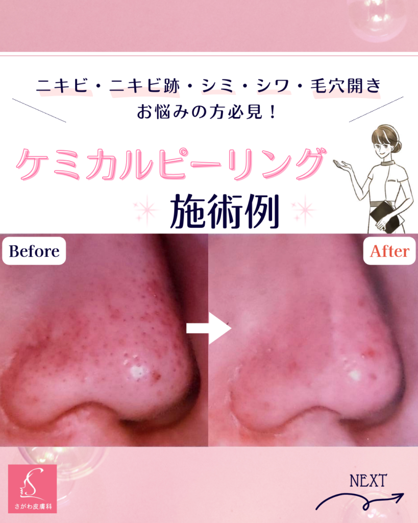 ケミカルピーリング施術例の写真は『鼻』です。毛穴トラブルの改善が期待できます。黒ずみを目立ちにくくし、透明感のある若々しい肌に導く効果が期待できます。開いた毛穴の引き締めにも効果的です。