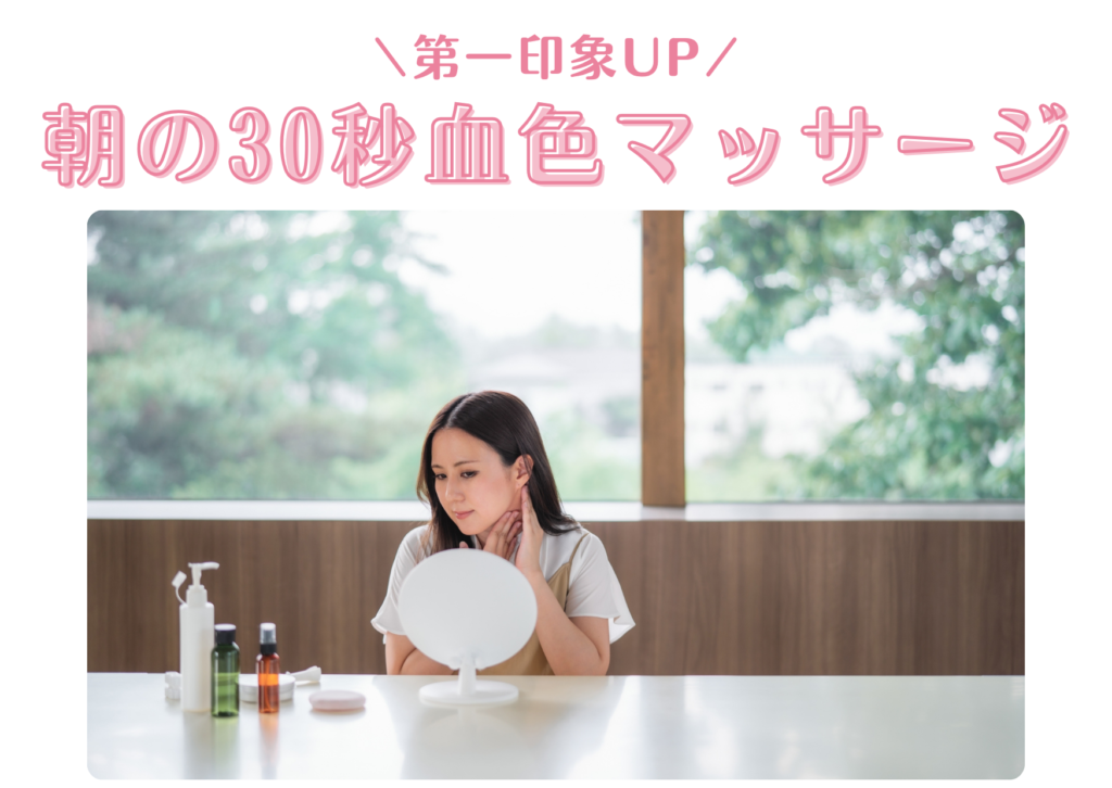 環境の変化で緊張が続くと、顔の血色が悪くなりがち…。 メイク前に耳の周りをくるくる回したり、 鎖骨の下を軽く流すだけで、顔色がパッと明るくなります。 「疲れ顔」を新生活に持ち込まないのが垢抜けのコツ◎